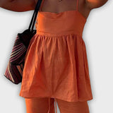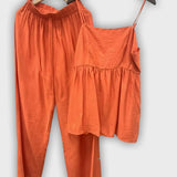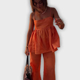 עשוי מבד קליל ונושם, הסט הזה אידיאלי לימים החמים. אתה/את יכול/ה ללבוש אותו כל היום מבלי להזיע. הצבע הבהיר כתום מפיץ אנרגיה טהורה ושמחת חיים!