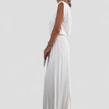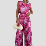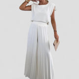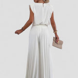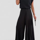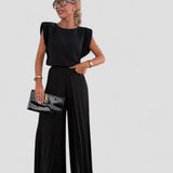 כולל טופ ללא שרוולים עם צווארון V ומכנסיים רחבים עם חגורת אלסטית, הסט הזה מציע סילואט זורם שעובר בקלות מיום ללילה.