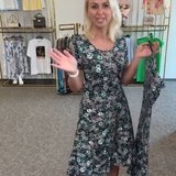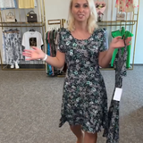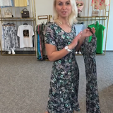 דפוס פרחוני אלגנטי: השמלה מעוטרת בהדפס פרחוני עדין בגוונים רכים של ירוק, סגול ולבן על רקע כהה. הדפוס העדין מוסיף עומק ועניין ויזואלי תוך שמירה על מראה יומיומי מעודן. הוא מוסיף קסם מבלי להשתלט על המראה שלך.