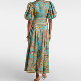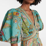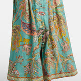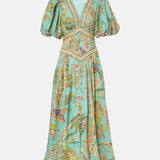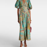 הדפס אמנותי מעודן: שמלת טליקהמעוטרת בהדפס מורכב המשלב מוטיבים פרחוניים, פייזלי וחיות שובבות. הדבר יוצר שטיח עשיר ומרתק לעין, המעניק לשמלה מראה יוקרתי ומלא אופי. הדפוסים מסודרים בסימטריה ובאלגנטיות, המדגישים את הגזרה הכללית ומעניקים לשמלה מראה אומנותי ויוקרתי.